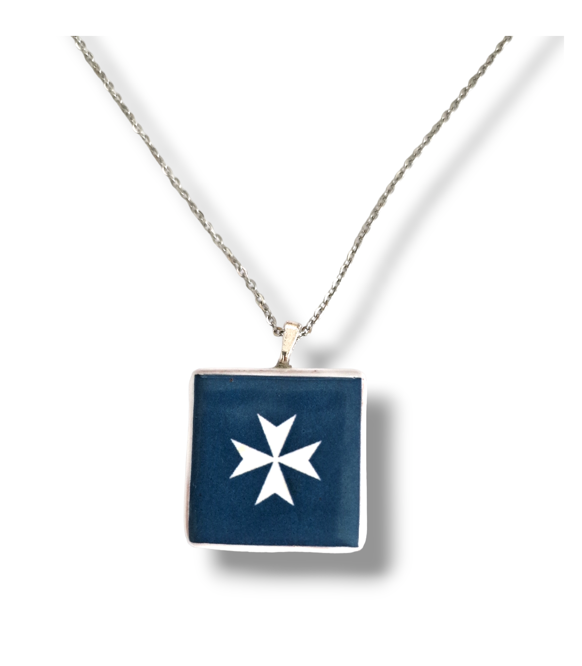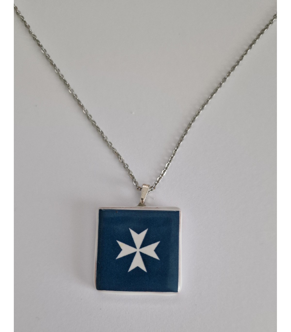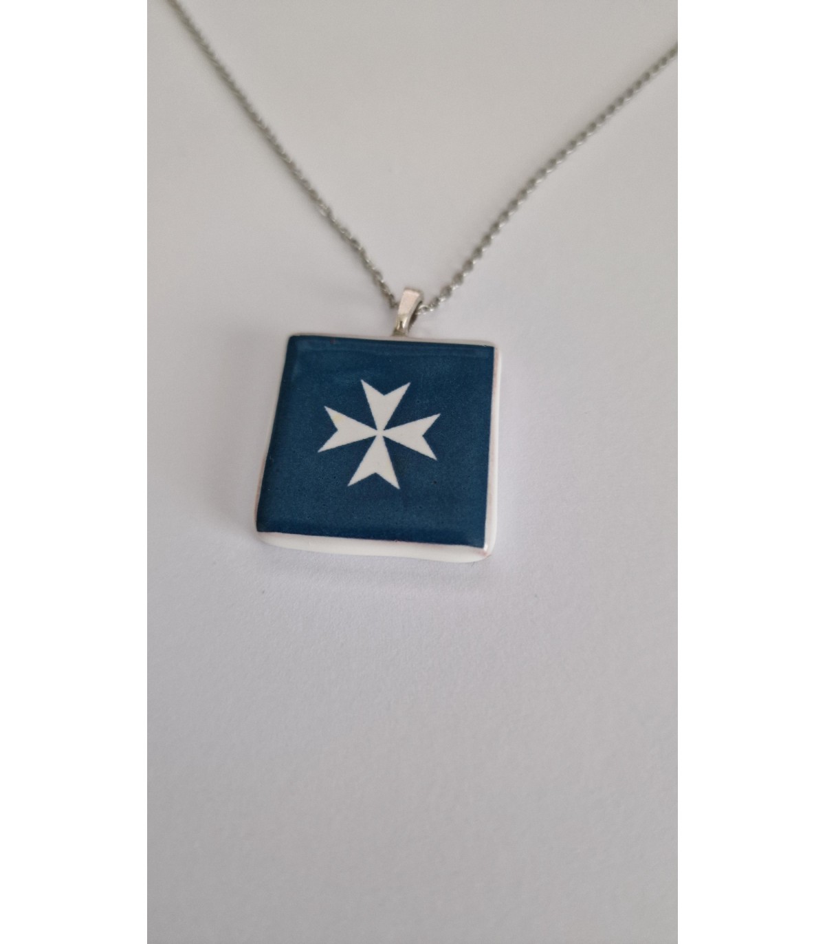 Ciondolo maiolica in ceramica con croce di malta, colore blu scuro. Con catenina in acciaio inox