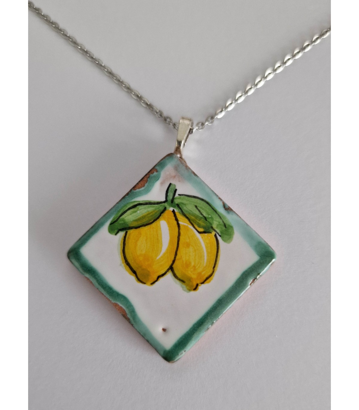 Ciondolo maiolica in ceramica con limone dipinto a mano. Con catenina in acciaio inox