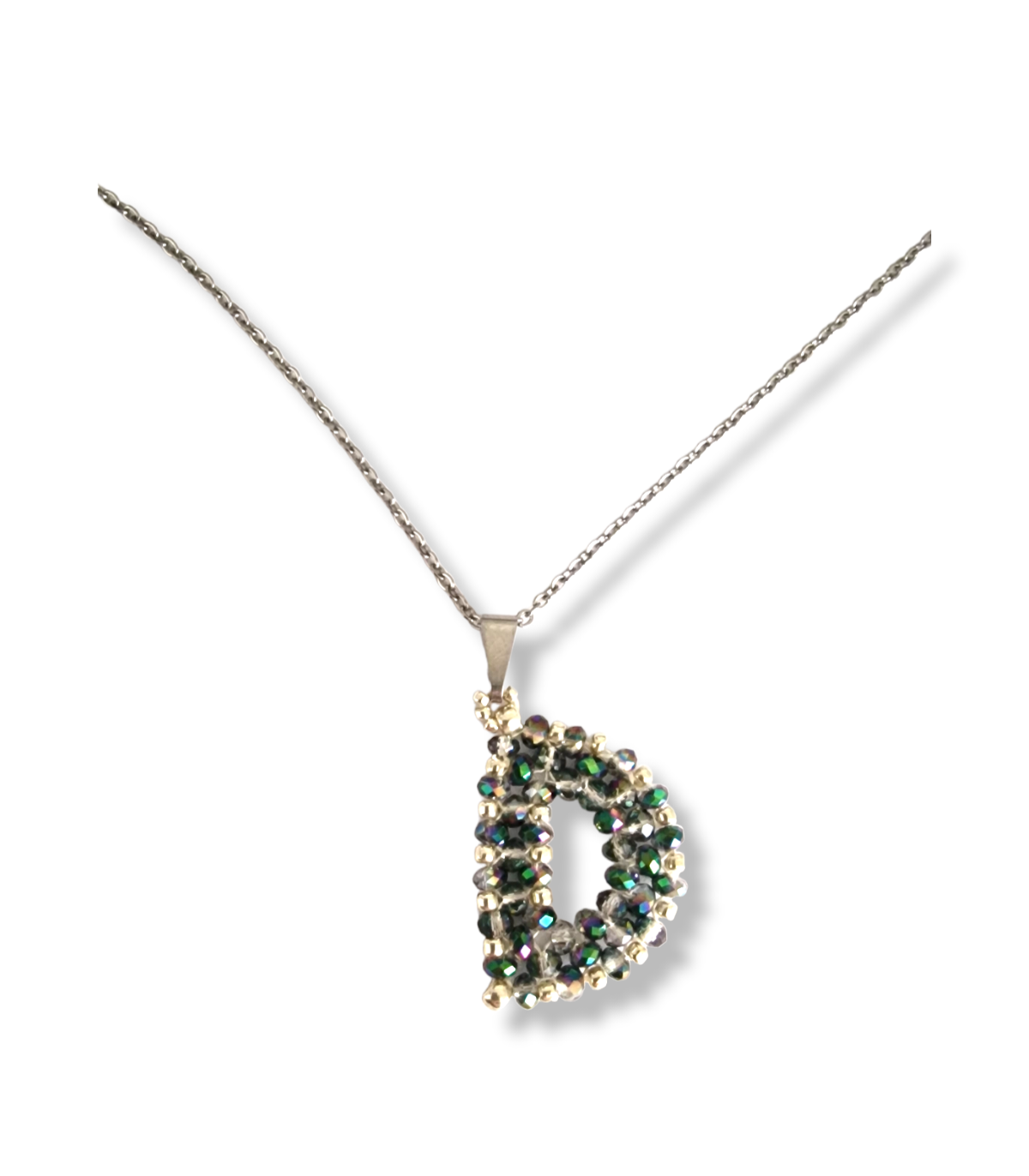 Collana con lettera D piatto mezzicristalli verdi e perline argentate