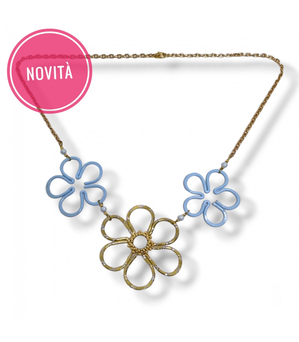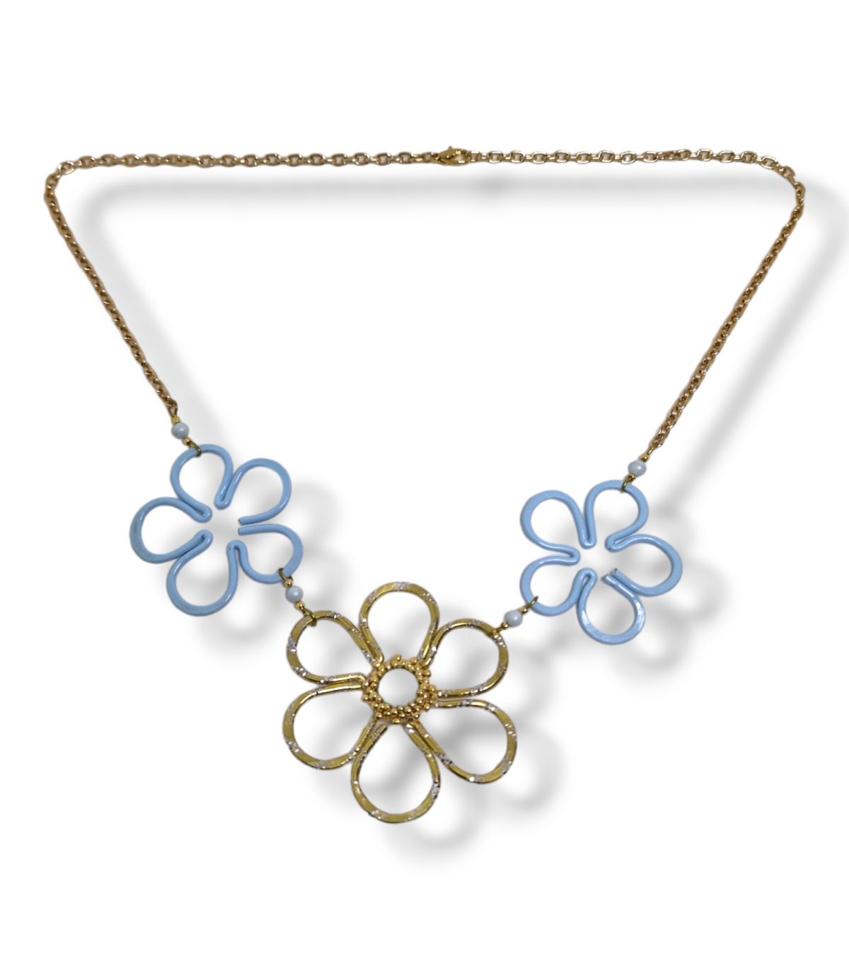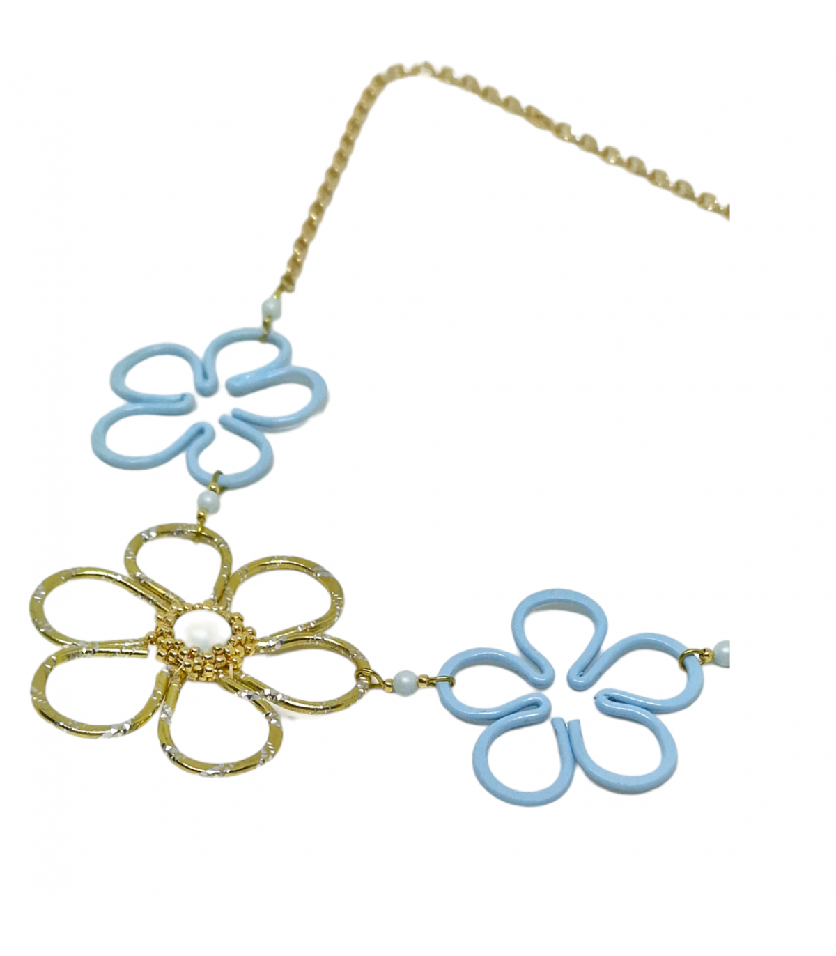 - Collana con 3 fiori realizzati in alluminio dorato e azzurro pastello, catena in alluminio, chiusura in acciaio dorato. Il fiore centrale presenta una perla Swarovski centrale incastonata a mano con perline. Lunghezza: 55,5 cm, decorazione centrale: 18 cm; Fiore centrale: 5,5 cm; Perla centrale 1 cm , perle più piccole 0,4 mm.