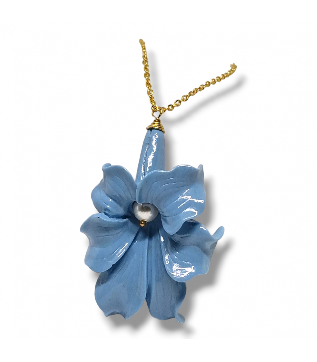 - Catenina dorata 1,5 mm di spessore con fiore pendente in resina azzurro e perla Swarovski. Minuteria in acciaio. Lunghezza: 50 cm; Lunghezza fiore centrale 5 cm; Larghezza: 3, 5 cm