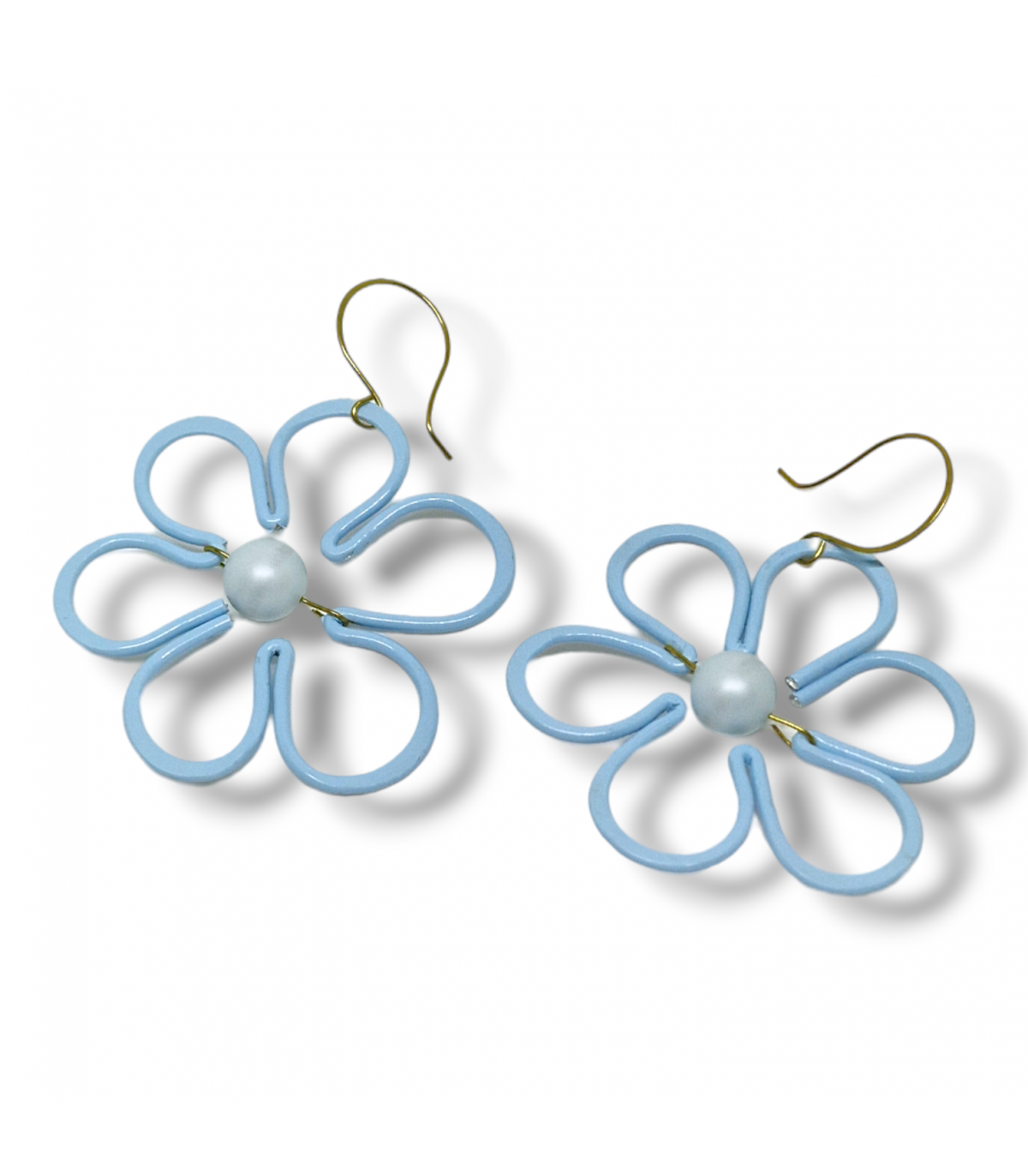 - Orecchini in alluminio azzurro pastello e ottone realizzati a mano con perle Swarovski centrali. Lunghezza: 7,5 cm circa;Larghezza: 4,5 cm; Perla centrale: 12 mm