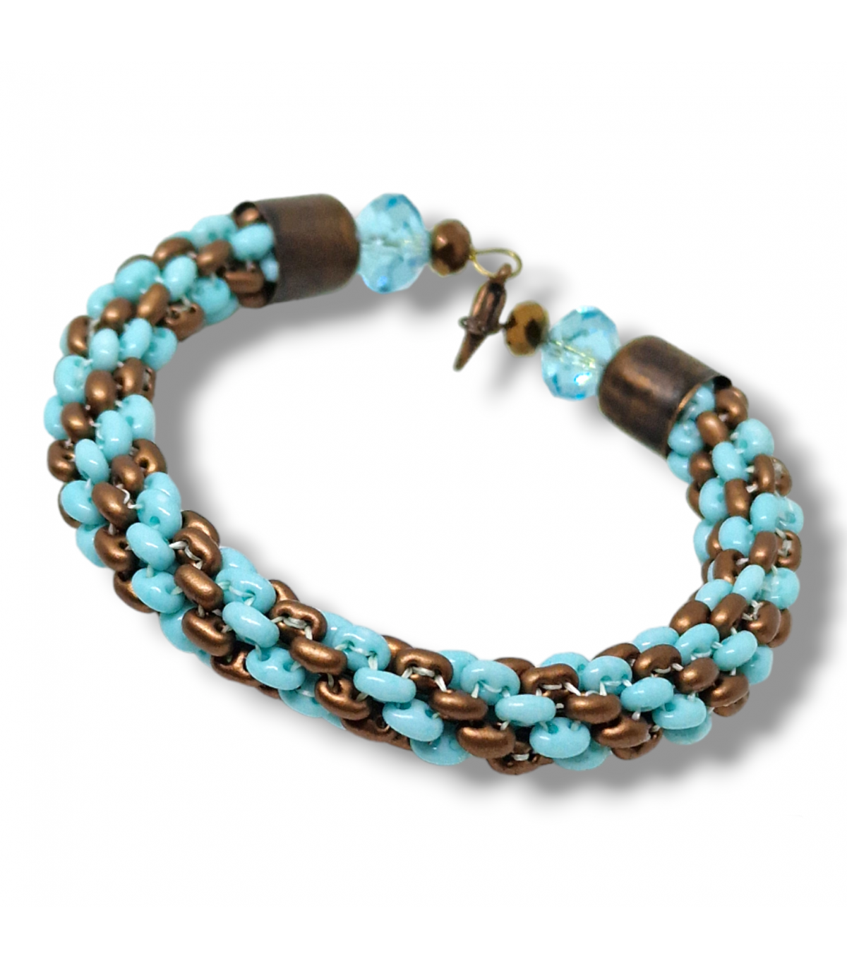 - Bracciale rigido tubolare realizzato a mano con perline. Colori azzurro chiaro e bronzo. Minuteria in lega e mezzicristalli tono su tono. Spessore: 1 cm