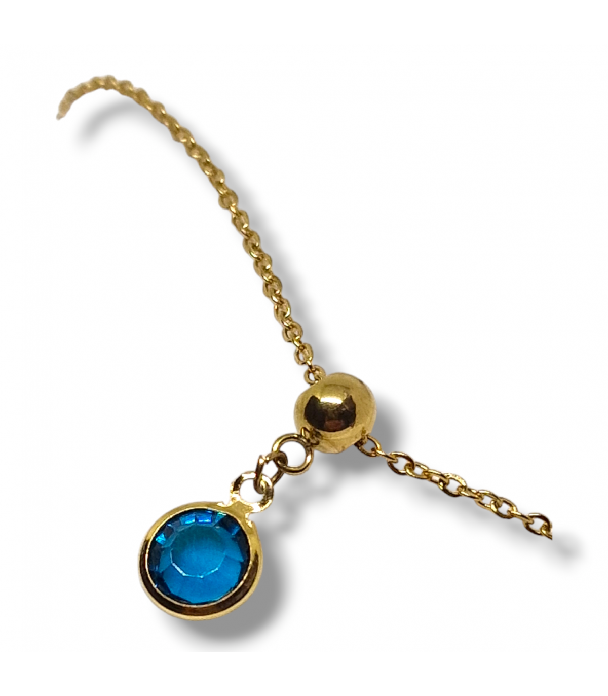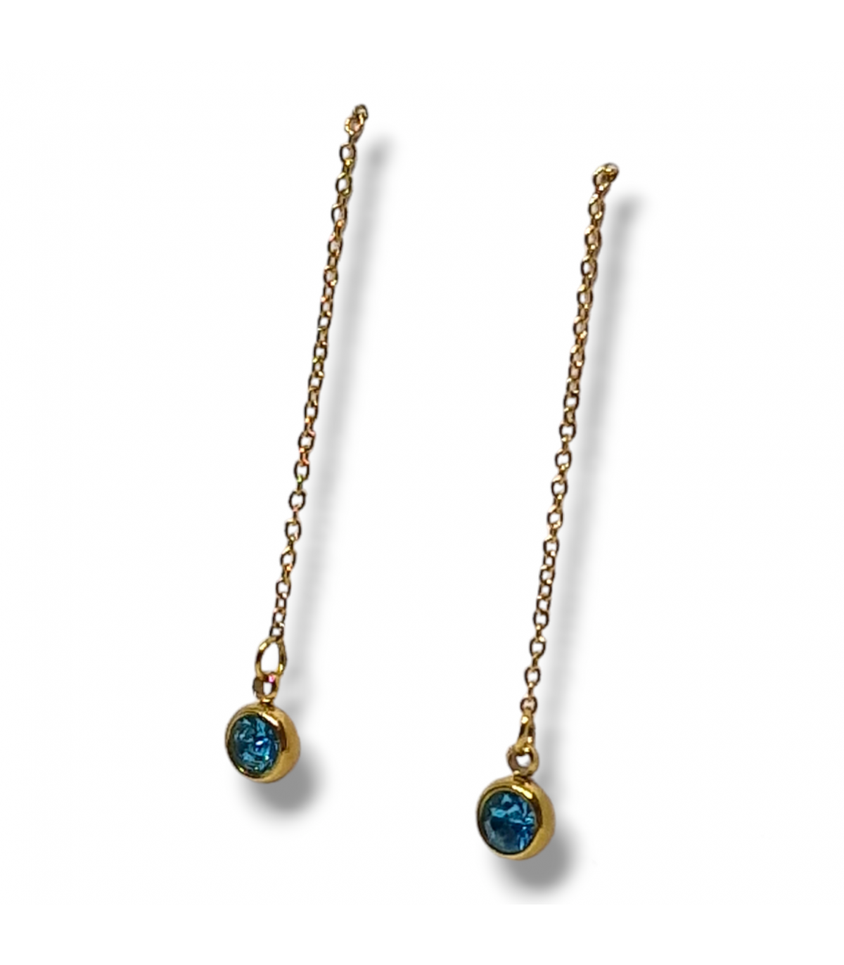 - Orecchini pendenti con catena sottile e punto luce finale nelle colorazioni acciaio dorato e punto luce azzurro. Lunghezza orecchini: 6 cm regolabili; Larghezza punto luce: 0,6 cm