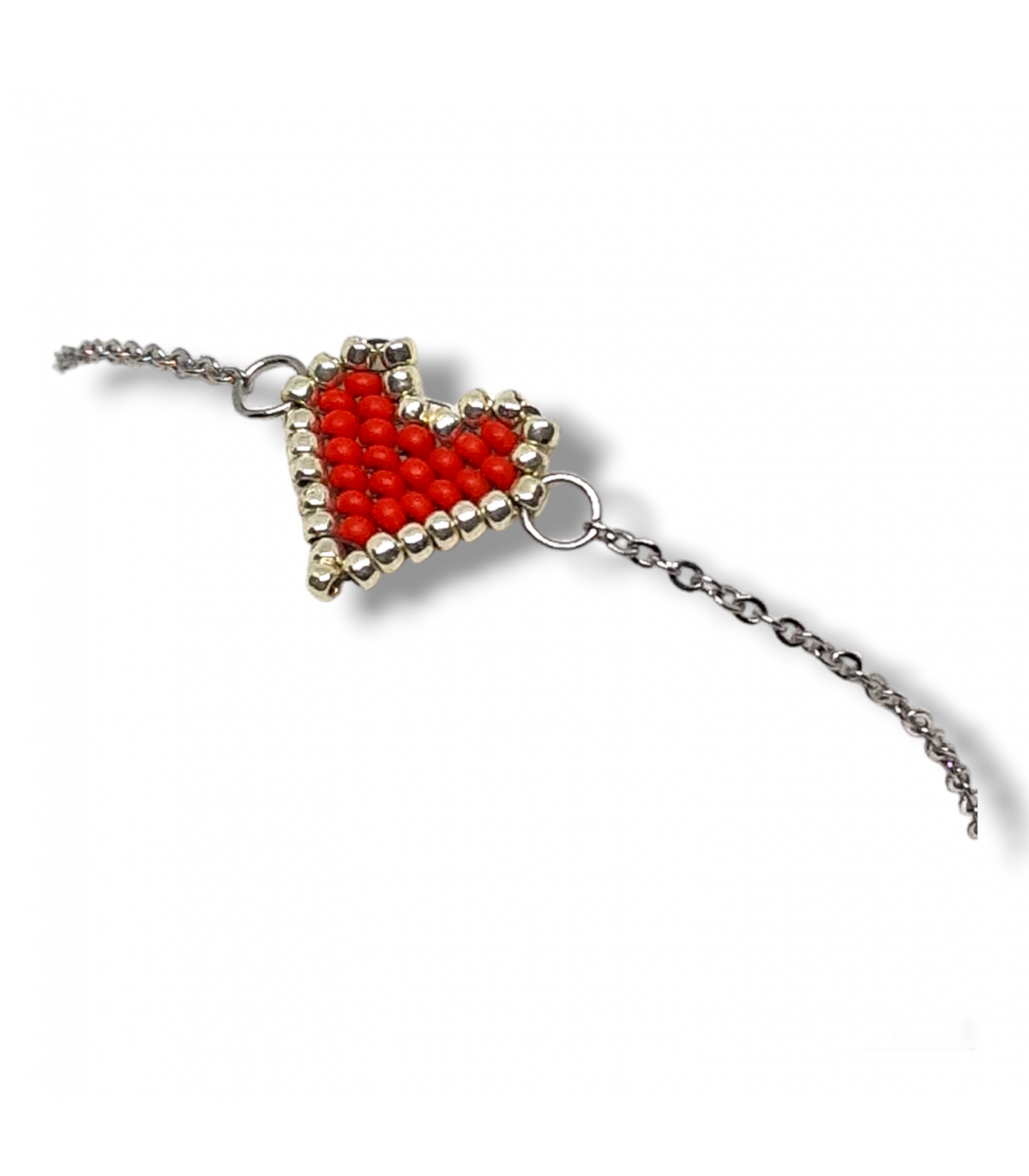 - bracciale con catenina in acciaio, color argento e rosso, moschettone in acciaio e cuoricino centrale realizzato a mano con perline rosse e argentate. Dimensione cuore centrale, 1,5 cm x 1,5 cm. Lunghezza bracciale totale 19 cm; Spessore catena: 2 mm circa;