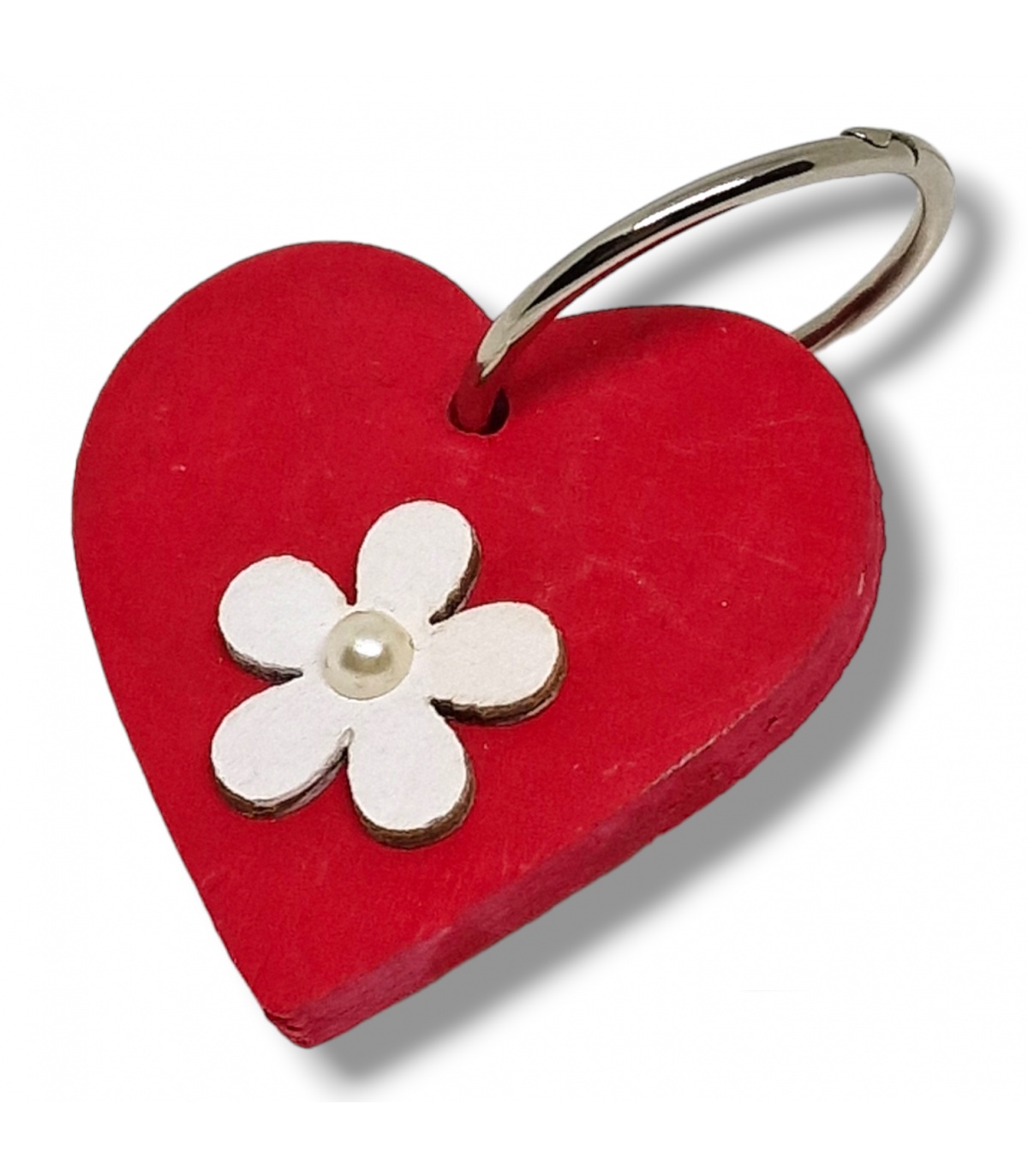 - portachiavi a cuore in legno rosso con fiore al di sopra e mezzaperla;