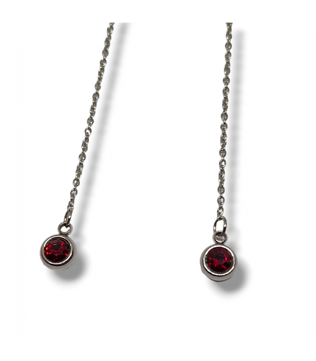 - orecchini con catena sottile in acciaio e punto luce rosso; Lunghezza 5,5 cm