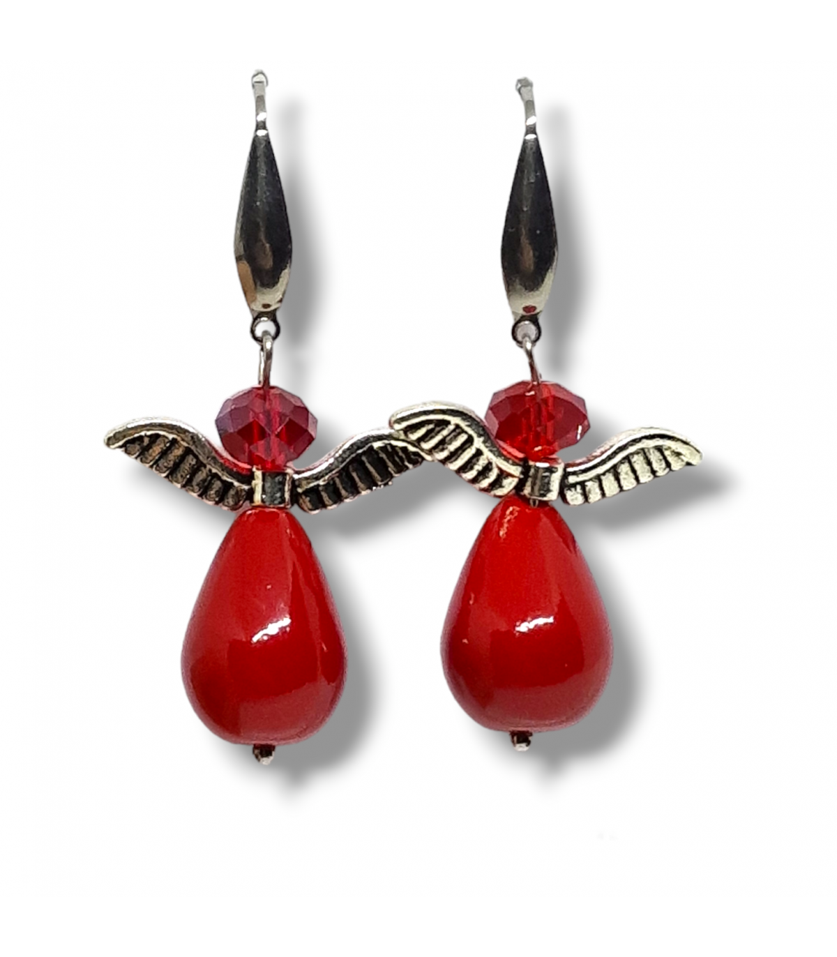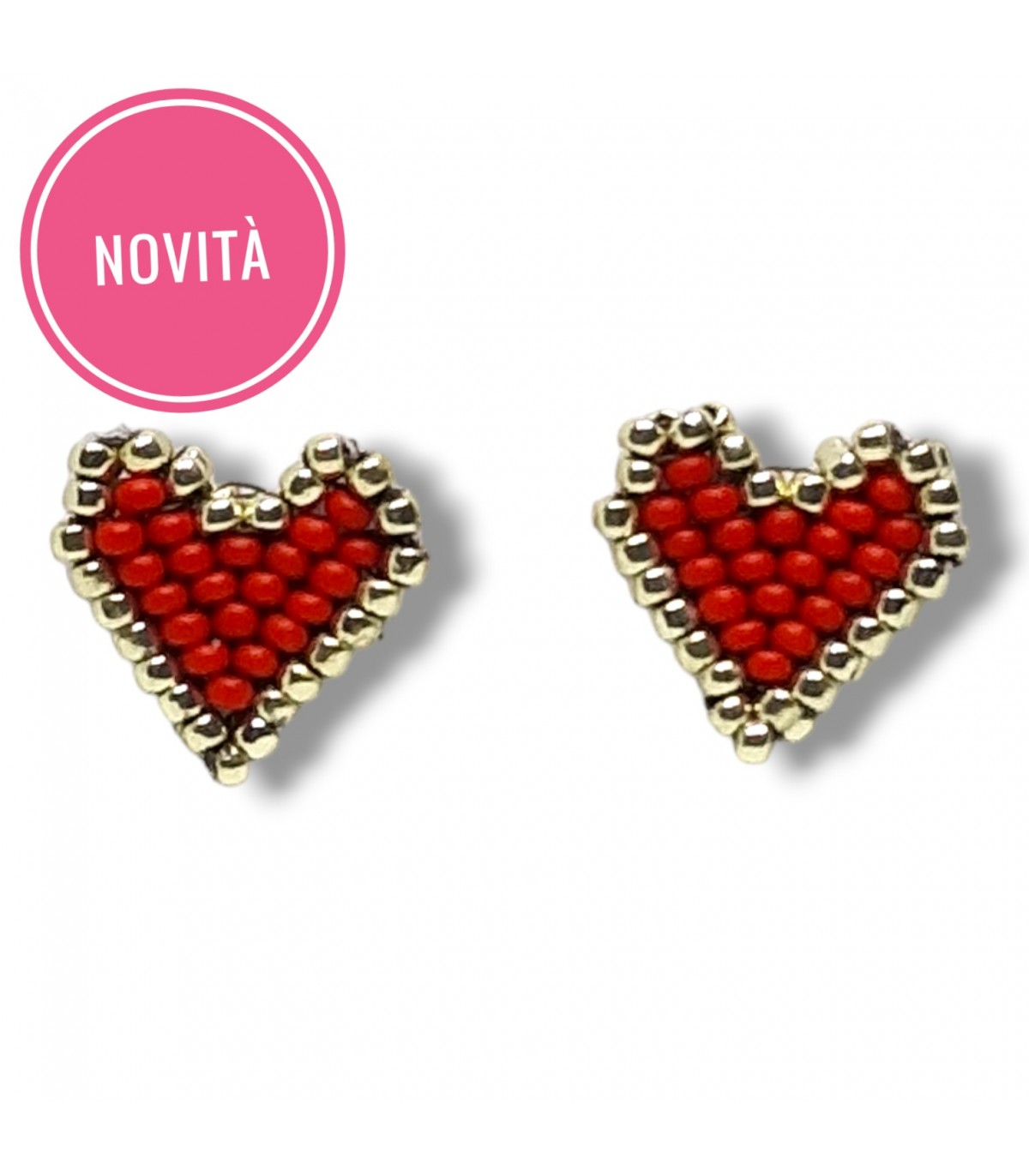 - un paio di orecchini a lobo a forma di cuore realizzati a mano con perline, nei colori argento e rosso; Altezza: 1,5 cm Larghezza 1,5 cm;